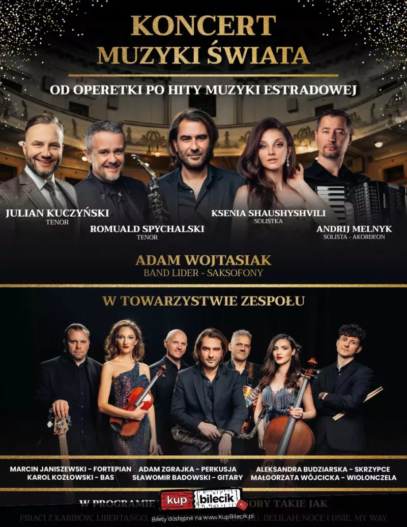 Koncert Muzyki Świata! To kolejny z serii koncertów pod hasłem od Operetki po Hity Muzyki Estradowej. W tę Muzyczną podróż zabierze Nas wyjątkowa, 10 osobowa grupa muzyków i solistów pochodząca z różnych krajów Europy. Wyjątkowe aranże, nieznane dotąd wersje znanych i uwielbianych utworów usłyszymy i zobaczymy na żywo! Artyści zaprezentują między innymi Libertango (Akordeon), Arie ze Skrzypka na dachu, hity operetkowe, muzykę z filmu "Piraci z Karaibów" oraz "Zapach Kobiety", Piosenkę Francuską (Edith Piaf) Ujmujące Ballady Gruzińskie jak i Włoskie przeboje w wiązance Volare, My way i wiele innych, które pozostaną niespodzianką do dnia koncertu.