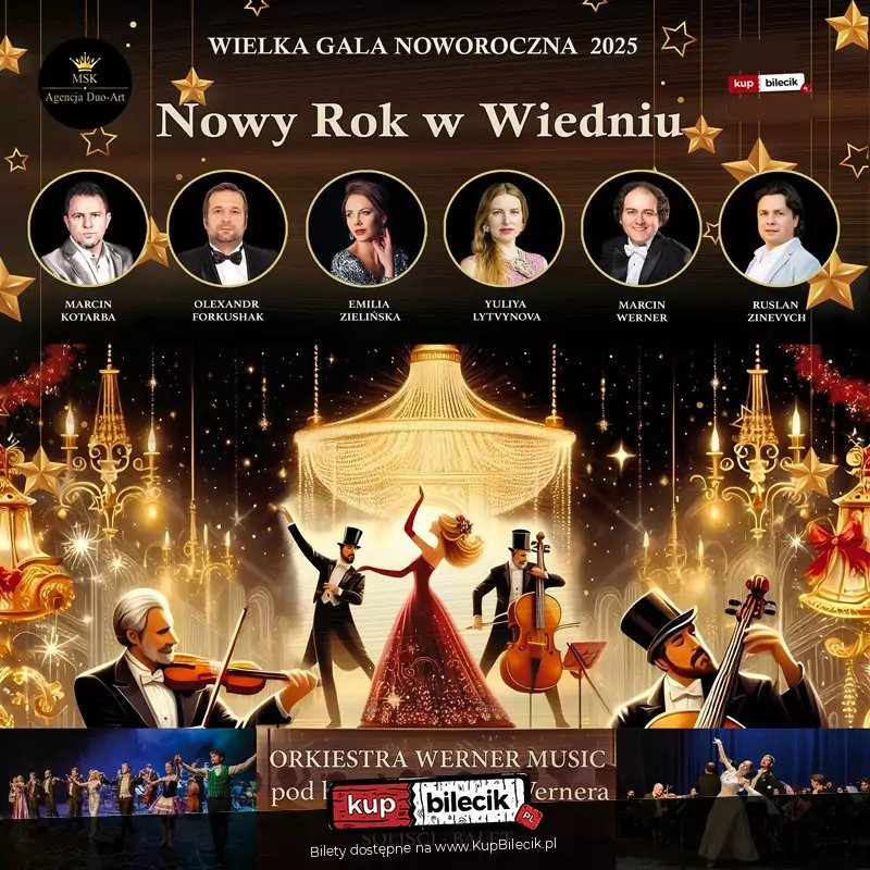 Już teraz pragniemy zaprosić Państwa w magiczną, karnawałową podróż do roztańczonego Wiednia! Podczas tego dwuczęściowego koncertu zaprezentowane zostaną dystyngowane walce, gorące czardasze, najpiękniejsze arie i duety operetkowe oraz wielkie przeboje świata estrady a wszystko to w wykonaniu wybitnych solistów, tancerzy oraz orkiestry. Nasz koncert to połączenie klasycznej wiedeńskiej formy z współczesnymi przebojami, co stanowi gwarancję wspaniałej zabawy i szampańskiego nastroju! Nie może Państwa zabraknąć! Przywitajmy wspólnie Nowy 2025 Rok!Wystąpią dla Państwa wybitni soliści sceny operowej i operetkowej: