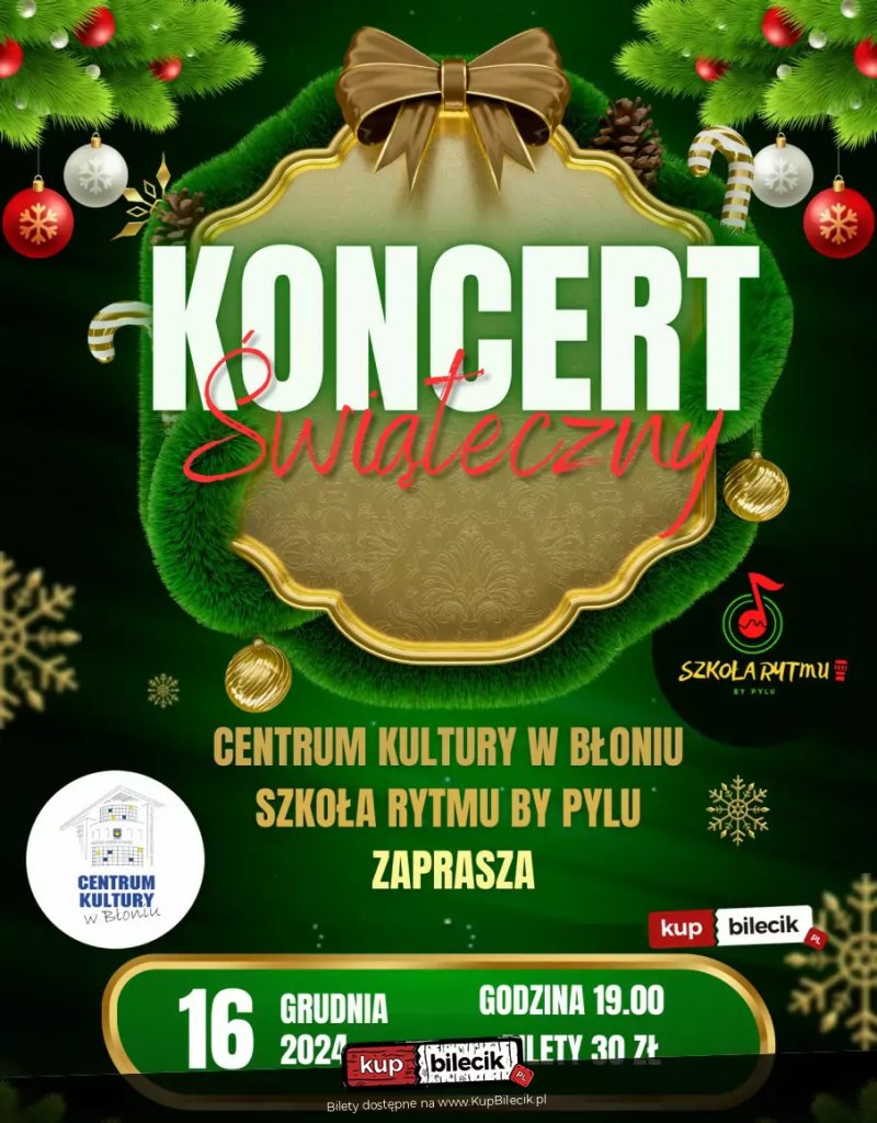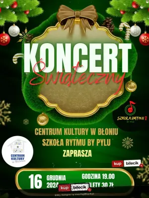 Święta Bożego Narodzenia to wyjątkowy i najpiękniejszy czas w całym roku - pełen uroku i niezwykłych chwil. Magia tych świąt polega na niepowtarzalnej atmosferze, jaka towarzyszy nam już od początku grudnia. Wykonawcami będą uczniowie i instruktorzy Szkoły Rytmy by Pylu. W programie znajdą się najpiękniejsze polskie kolędy i pastorałki oraz utwory świąteczne w aranżacjach współczesnych, przy żywym akompaniamencie m.in. fortepian, akordeon, klarnet oraz instrumenty perkusyjne: djembe, konga, ksylofon, cajon, zestaw perkusyjny oraz inne perkusjonalia. Koncert poprowadzą Łukasz Pytlakowski i Dariusz Słapek.