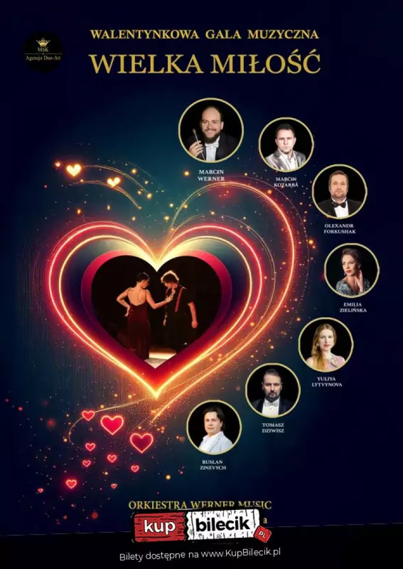 Zapraszamy na niezapomnianą Walentynkową Galę Muzyczną "Wielka miłość", która odbędzie się w Warszawie 5 lutego 2025 roku o godzinie 19:00. Przygotujcie się na wieczór pełen romantyzmu, humoru i przede wszystkim pięknej muzyki, która poruszy Wasze serca.