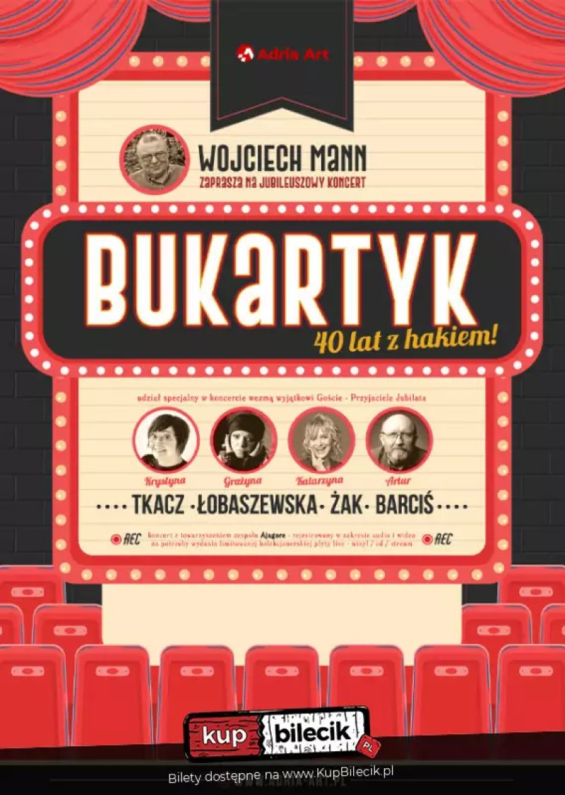 Podczas koncertu '40 lat z hakiem' usłyszysz największe przeboje Bukartyka, wykonywane zarówno solo, jak i w towarzystwie zespołu Ajagore oraz wyjątkowych gości, wśród których znajdą się Grażyna Łobaszewska, Krystyna Tkacz oraz Artur Barciś. Każdy utwór zostanie wzbogacony o opowieści artysty, dodające głębi wieczorowi.