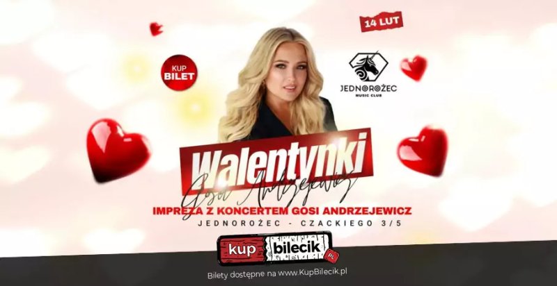 Przygotuj się na niezapomniane Walentynki w rytmach największych hitów! 14 lutego 2025 roku, o godzinie 22:00, Gosia Andrzejewicz zaprasza na wyjątkowy koncert w Klubie Jednorożec w Warszawie. To idealna okazja, aby spędzić romantyczny wieczór w towarzystwie jednej z najbardziej lubianych polskich wokalistek. Koncert obejmie szeroki repertuar, od kultowych utworów lat 80. i 90. aż po najnowsze przeboje. Nie przegap tej wyjątkowej nocy pełnej muzyki i emocji. Czy jest lepszy sposób na świętowanie Walentynek niż koncert Gosi Andrzejewicz w stolicy? Zarezerwuj bilety już dziś i zaskocz swoją drugą połówkę niezapomnianym prezentem!