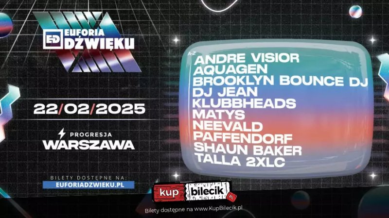 Przygotuj się na niezapomnianą noc z Euforią Dźwięku, jednym z największych wydarzeń muzycznych w Polsce! 22 lutego 2025 roku, scena w Warszawie ponownie rozbrzmi elektronicznymi dźwiękami, które porwą Cię do tańca. Dołącz do nas i przeżyj ekscytujące chwile przy muzyce topowych DJ-ów takich jak ANDRE VISIOR, AQUAGEN, BROOKLYN BOUNCE, DJ JEAN, KLUBBHEADS, MATYS, NEEVALD, PAFFENDORF, SHAUN BAKER i TALLA 2XLC. Euforia Dźwięku to wydarzenie stworzone dla miłośników mocnych basów i energetycznych rytmów. Czekają na Ciebie niezapomniane wrażenia i całonocna zabawa tylko dla osób pełnoletnich. Nie przegap tej elektryzującej nocy muzyki!