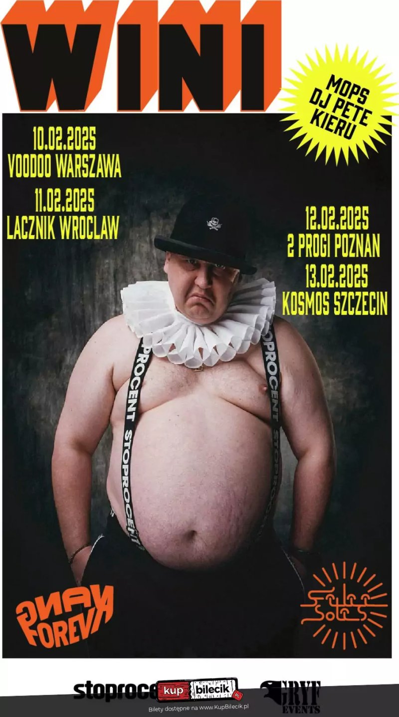 Przygotujcie się na niezapomniany wieczór pełen hip-hopowych rytmów! Wini, znany również jako Winicjusz Bartków, raper, producent i twórca marki Stoprocent, przybywa do Warszawy, by zaprezentować swoje najnowsze dokonania muzyczne. Jego unikalny styl, połączenie humoru, sarkazmu i głębokiej introspekcji, przyciąga fanów z całego kraju. Koncert odbędzie się 10 lutego 2025 roku o godzinie 19:00.