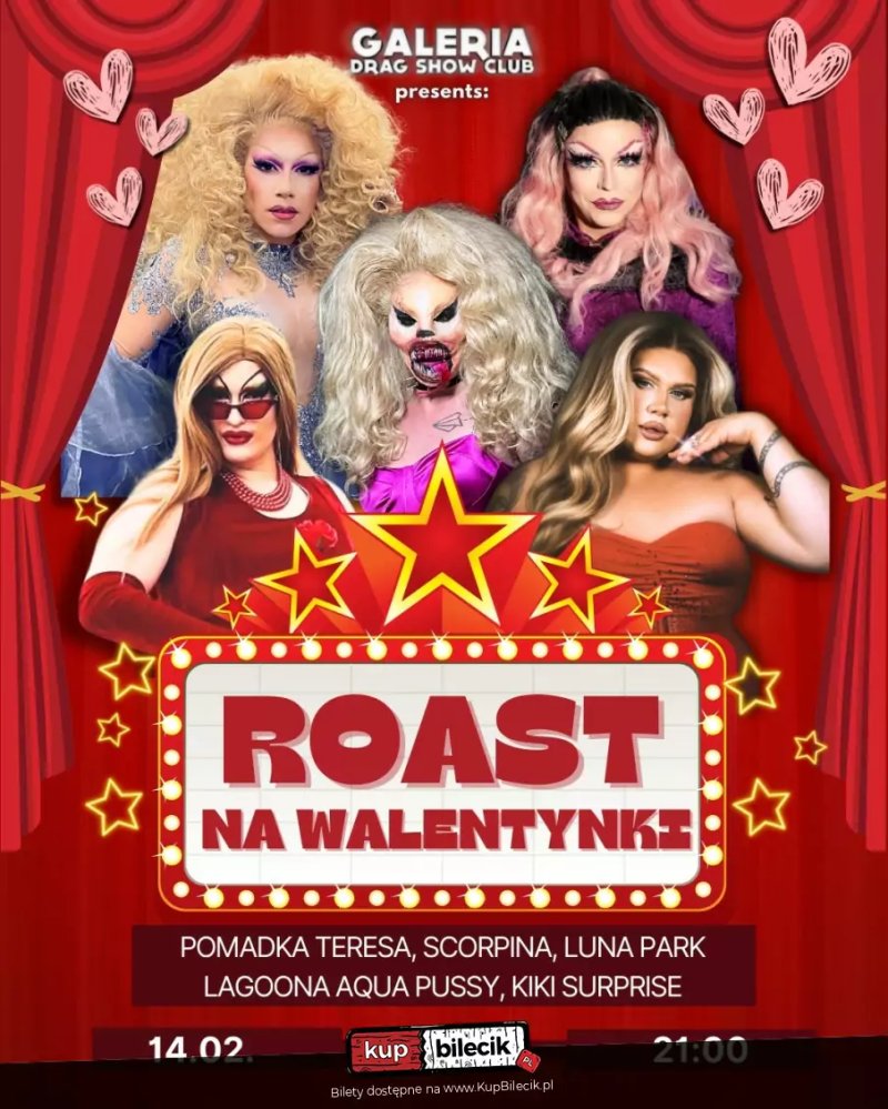 Zapomnij o nudnych Walentynkach! Przyjdź na Drag Roast w Warszawie, gdzie pięć niepowstrzymanych drag queens rozbawi Cię do łez. Złośliwe uwagi, cięte riposty i totalny brak tabu to tylko niektóre z atrakcji tego wieczoru. Przygotuj się na intymne sekrety, drwiny z wyglądu i mnóstwo śmiechu. Miłość to nie tylko kwiatki, to także odważne słowa i szalona zabawa! Wystąpią: Pomadka Teresa, Lagoona Aqua Pussy, Scorpina, Luna Park i Kiki Surprise. Nie przegap tego wyjątkowego wydarzenia!