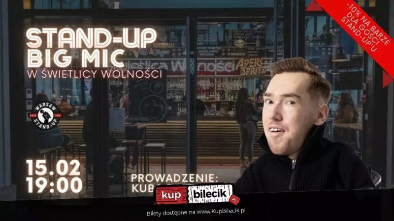Zapraszamy na wyjątkowy wieczór stand-upu z Kubą Rafalskim w Świetlicy Wolności w Warszawie! Big Mic to niepowtarzalna okazja, aby zobaczyć najlepszych komików w akcji. To wydarzenie, które łączy pasję do komedii z klimatycznym miejscem spotkań, które na stałe wpisało się w kulturalno-intelektualną mapę Warszawy. Występy są dłuższe i bardziej dopracowane, co sprawia, że wieczór będzie pełen śmiechu i pozytywnej energii. Dodatkowo, dla uczestników wydarzenia przygotowaliśmy -10% na barze, co czyni ten wieczór jeszcze bardziej atrakcyjnym. Przyjdź i przekonaj się, jak wspaniale można spędzić sobotę w towarzystwie świetnych komików i przyjaciół. Pamiętaj, że wydarzenie jest przeznaczone dla osób powyżej 18. roku życia. Nie przegap tej okazji na świetną zabawę i niezapomniane wrażenia! Zarezerwuj swoje miejsce już teraz i dołącz do nas na Big Mic Stand-up w Warszawie!