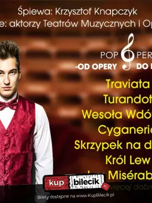 Zapraszamy na muzyczne widowisko, które zabierze Państwa w niezwykłą podróż - od wzruszających arii operowych, przez porywające hity musicalowe, aż po kultowe utwory muzyki rozrywkowej. Pop Opera - Od Opery do Musicalu to wydarzenie, które za każdym razem zaskakuje czymś nowym. Muzyka połączy pokolenia. Najpiękniejsze arie operowe i ponadczasowe przeboje musicalowe w mistrzowskim wykonaniu solistów Teatrów Muzycznych i Operowych. Na scenie pojawią się artyści, którzy oczarowali publiczność na światowych scenach - w tym tenor Krzysztof Knapczyk, znany z niezwykłej ekspresji i głosu, który zapada w pamięć.