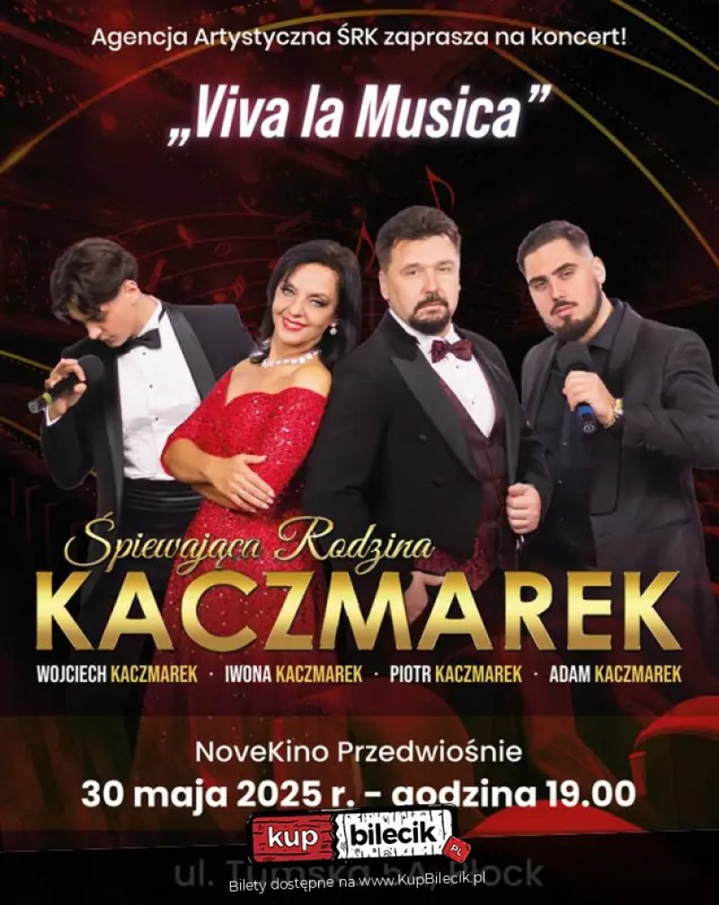 Przygotuj się na wieczór pełen emocji z koncertem "Viva La Musica" w Płocku! Śpiewająca Rodzina Kaczmarków, znana z wyjątkowych interpretacji muzyki klasycznej, zaprasza na niezapomniane przeżycia muzyczne. W programie najpiękniejsze melodie z operetek takich jak "Wesoła wdówka" i "Księżniczka Czardasza", a także przeboje z musicali jak "Skrzypek na dachu" czy "My Fair Lady". Iwona, Piotr, Adam i Wojciech zabiorą Cię w podróż do magicznego świata muzyki, gdzie usłyszysz także znane standardy rozrywkowe w wykonaniu tych utalentowanych artystów. To będzie niezapomniany spektakl, który na długo pozostanie w Twojej pamięci. Spędź ten wieczór wyjątkowo i dołącz do nas!