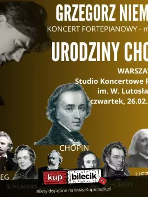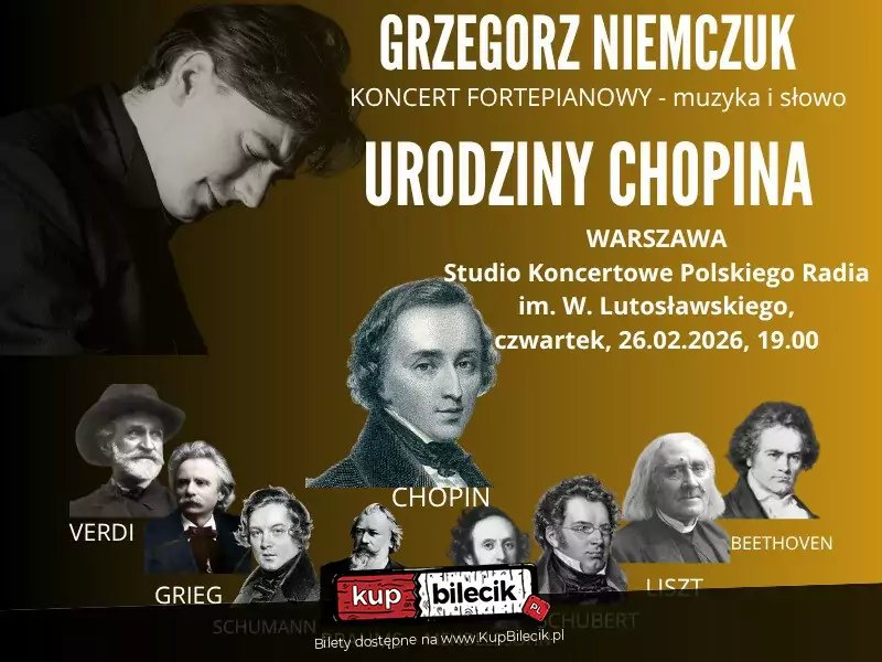 Zapraszamy na niezapomniany koncert fortepianowy z okazji 216. rocznicy urodzin Fryderyka Chopina! Grzegorz Niemczuk, jeden z najbardziej utalentowanych polskich pianistów, poprowadzi wieczór pełen emocji w Warszawie 26 lutego 2026 roku. Usłyszymy arcydzieła romantycznych kompozytorów, takich jak Beethoven, Chopin, Schumann i Liszt. Ten wyjątkowy spektakl to nie tylko muzyka, ale także opowieści o wielkich twórcach, które wprowadzą publiczność w świat ich geniuszu. Grzegorz Niemczuk, znany z błyskotliwego prowadzenia koncertów, sprawi, że każdy utwór stanie się niezapomnianym przeżyciem. To doskonała okazja, by poznać bliżej muzykę romantyczną i cieszyć się jej pięknem. Przyjdź i doświadcz magicznego wieczoru, który na długo pozostanie w Twojej pamięci. Spędź ten wieczór wyjątkowo i dołącz do nas!