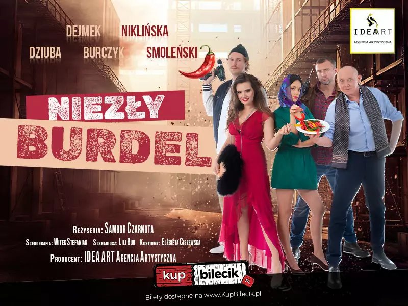 "Niezły Burdel" to nie tylko spektakl, to teatralna uczta dla miłośników dobrej komedii! W reżyserii Sambora Czarnoty i z wyjątkową obsadą, w której występują Maria Niklińska, Karol Dziuba, Paweł Burczyk oraz Arkadiusz Smoleński, każdy moment na scenie to prawdziwa uczta dla zmysłów. Zaskakujące zwroty akcji i tempo, które nie pozwala na chwilę wytchnienia, sprawią, że ten wieczór na długo pozostanie w pamięci.