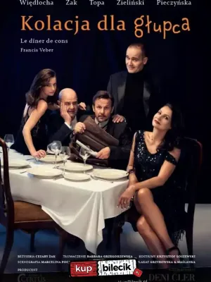 KOLACJA DLA GŁUPCATytułowa "kolacja dla głupca" ma być jedną z wielu, które we wtorkowe wieczory Pierre Brochant, bogaty wydawca i człowiek sukcesu, urządza ze swoimi wpływowymi przyjaciółmi. Na każdą zapraszają wyjątkowych nieudaczników, będących nieświadomymi niczego obiektami kpin i uczestnikami konkursu na największego frajera. Jak to często w komediach bywa, nieoczekiwany splot wydarzeń powoduje, niespodziewany zwrot akcji, w wyniku którego nie dochodzi do zaplanowanej kolacji a spotkanie głównych bohaterów Pierra Brochanta i Francoisa Pignona przeradza się w arcyzabawny spektakl. W komiczny sposób ukazuje bohaterów, ich słabości i wady. KOLACJA DLA GŁUPCA - to hit teatralny, od lat grany na deskach wielu światowych teatrów! To znakomita gra aktorska, wartka, zabawna akcja i zaskakujący finał.