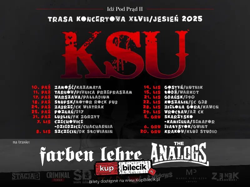 W towarzystwie znakomitych zespołów takich jak Farben Lehre, The Analogs, Strajk, Criminal Tango oraz Zenek Grabowski, wieczór zapowiada się jako prawdziwe święto muzyki. Przygotujcie się na wieczór pełen emocji i świetnej zabawy, który na długo pozostanie w Waszej pamięci. KSU zagra w Palladium, gdzie atmosfera będzie wręcz elektryzująca!