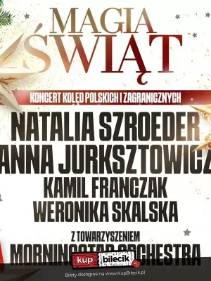 Przyjdź na wyjątkowy koncert kolęd w Warszawie, który przeniesie Cię w magiczny świat świątecznych melodii! "Magia Świąt" to wieczór pełen emocji, podczas którego usłyszysz zarówno polskie kolędy, jak "Cicha noc" czy "Lulajże Jezuniu", jak i zagraniczne hity, w tym "All I Want for Christmas Is You". Wystąpią znane i utalentowane osobowości, takie jak Natalia Szroeder, Anna Jurksztowicz, Kamil Franczak, Weronika Skalska oraz MorningStar Orchestra, którzy wspólnie stworzą niezapomniany spektakl pełen ciepła i radości. Wspólne wykonanie "Jingle Bell Rock" na zakończenie wieczoru dostarczy niezapomnianych wrażeń. To idealna okazja, aby poczuć świąteczną atmosferę w Warszawie 2 stycznia 2026 roku. Nie przegap tej wyjątkowej okazji na spędzenie czasu w gronie bliskich i przyjaciół. Zanurz się w magii muzyki i pozwól, aby ten koncert stał się Twoim świątecznym prezentem! Spędź ten wieczór wyjątkowo i dołącz do nas!