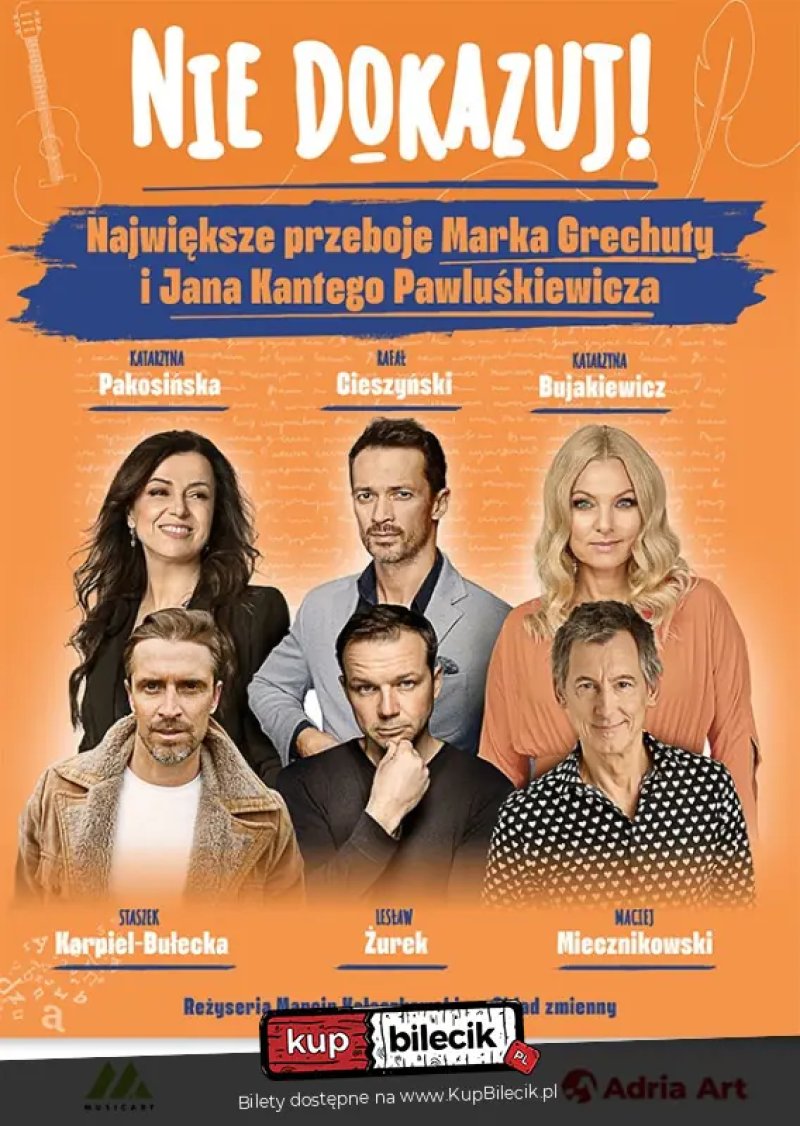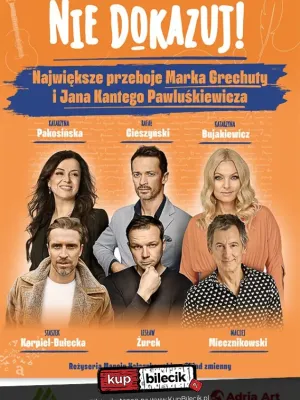 Wspaniali artyści, tacy jak Katarzyna Pakosińska, Katarzyna Bujakiewicz, Rafał Cieszyński, Lesław Żurek, Maciej Miecznikowski oraz Staszek Karpiel-Bułecka, przeniosą Cię w świat pełen wspomnień i muzyki. Koncert "Nie Dokazuj!" to nie tylko występ, to pełen humoru spektakl, w którym każda piosenka staje się pretekstem do anegdot i zabawnych historii z życia artystów.