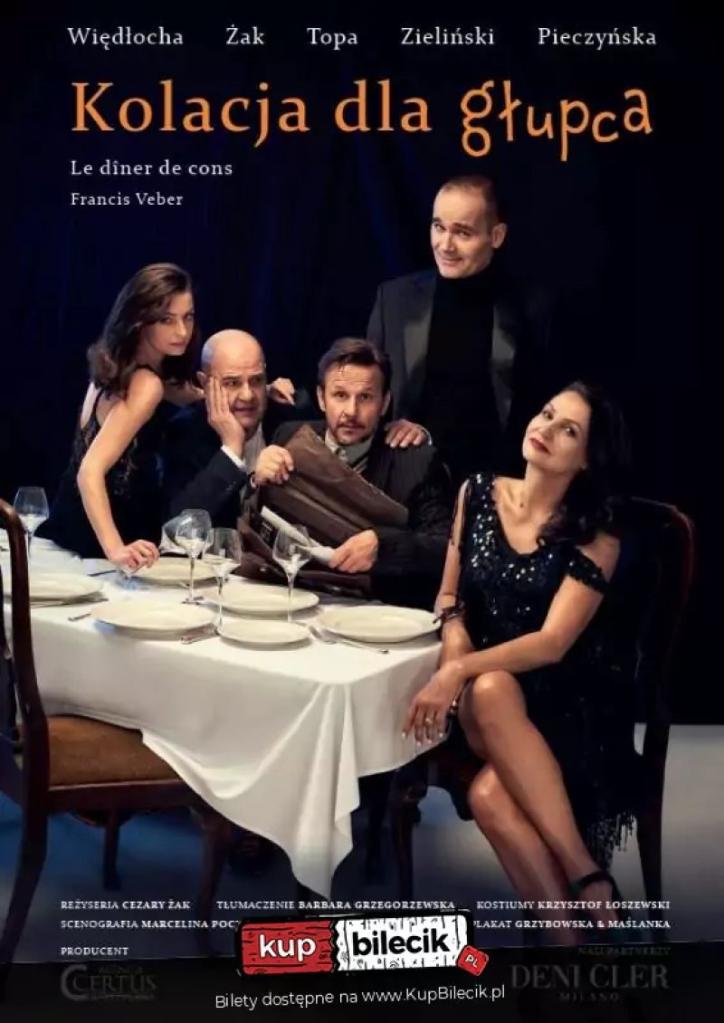 KOLACJA DLA GŁUPCATytułowa "kolacja dla głupca" ma być jedną z wielu, które we wtorkowe wieczory Pierre Brochant, bogaty wydawca i człowiek sukcesu, urządza ze swoimi wpływowymi przyjaciółmi. Na każdą zapraszają wyjątkowych nieudaczników, będących nieświadomymi niczego obiektami kpin i uczestnikami konkursu na największego frajera. Jak to często w komediach bywa, nieoczekiwany splot wydarzeń powoduje, niespodziewany zwrot akcji, w wyniku którego nie dochodzi do zaplanowanej kolacji a spotkanie głównych bohaterów Pierra Brochanta i Francoisa Pignona przeradza się w arcyzabawny spektakl. W komiczny sposób ukazuje bohaterów, ich słabości i wady. KOLACJA DLA GŁUPCA - to hit teatralny, od lat grany na deskach wielu światowych teatrów! To znakomita gra aktorska, wartka, zabawna akcja i zaskakujący finał.