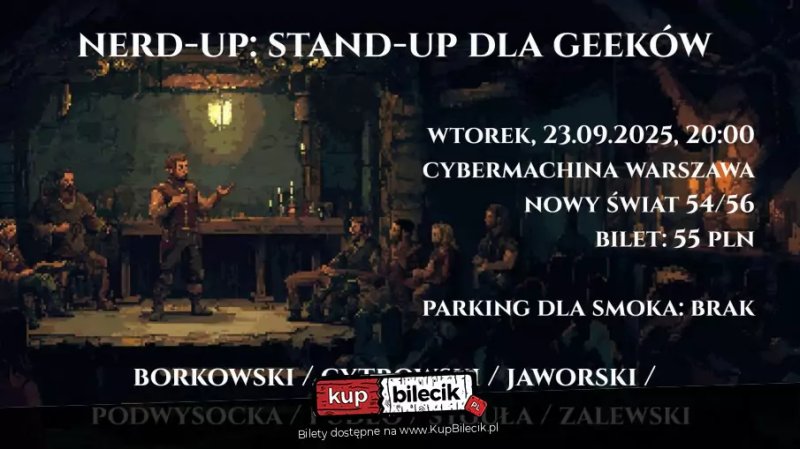 Przygotuj się na wieczór pełen emocji podczas wydarzenia Nerd-up, które odbędzie się 23 września 2025 roku w Warszawie! To wyjątkowy stand-up, w którym doborowi komicy, w tym Jasiek Borkowski, Arnold Cytrowski, Szymon Jaworski, Martyna Podwysocka, Jakub Pudło oraz Bartosz Zalewski, przekształcą swoje nerdowskie pasje w niezapomniany spektakl. Jeśli jesteś miłośnikiem gier, komiksów czy filmów ze smokami, ten wieczór jest stworzony dla Ciebie! Przygotuj się na pełen humoru występ, który sprawi, że Twoje codzienne ciastko komedii zyska nową, nerdową posypkę. Kacper Syguła poprowadzi ten wyjątkowy wieczór, a każdy z komików wprowadzi na scenę swoje unikalne spojrzenie na świat geeków. Nie przegap okazji na świetną zabawę w Warszawie, gdzie śmiech i pasja połączą się w jedno. Spędź ten wieczór wyjątkowo i dołącz do nas!