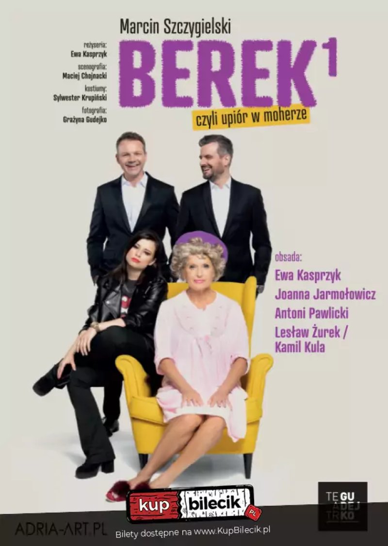 "Berek, czyli upiór w moherze" to inteligentna i bawiąca do łez historia na podstawie książki Marcina Szczygielskiego pt. "Berek". Sztuka po kilku latach wraca na afisz teatralny. Szacuje się, że spektakl został wystawiony już ponad 1000 razy!